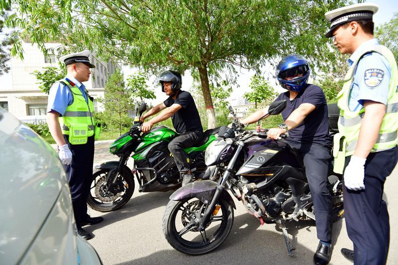 連日來,甘肅省臨澤縣公安局交警大隊開展打擊整治“飆車炸街”違法犯罪專項行動,切實維護道路交通秩序和公共安全。圖為6月6日,交警正在嚴(yán)查道路“飆車炸街”違法行為。通訊員 安學(xué)海 攝