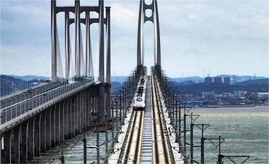 圖為8月31日,福廈高鐵運(yùn)行試驗(yàn)列車駛過福廈高鐵泉州灣跨海大橋。胡鵬/攝