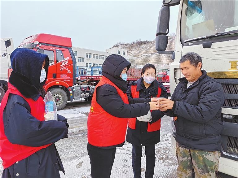 近日,甘肅省高速公路服務(wù)集團(tuán)志愿者在服務(wù)區(qū)為貨車司機(jī)“送溫暖”。華運(yùn)高速公路服務(wù)區(qū)管理有限公司供圖
