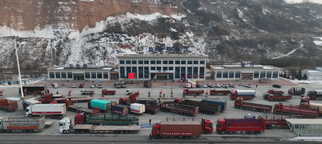 運(yùn)送救災(zāi)物資的貨車(chē)車(chē)隊(duì)在臨夏服務(wù)區(qū)休整