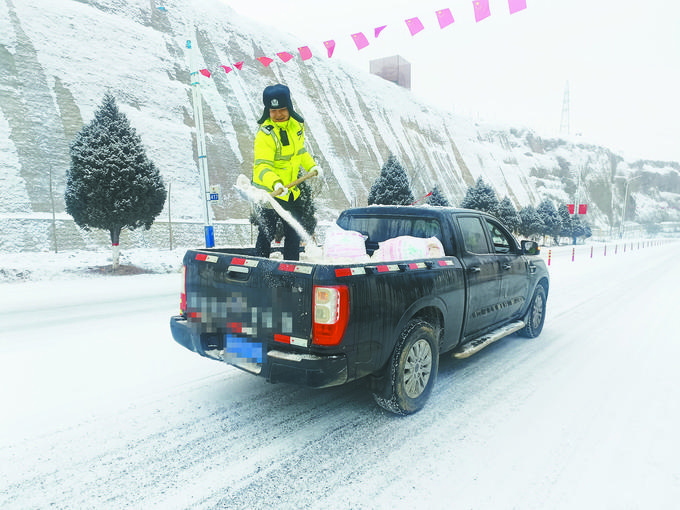 1月21日,新疆維吾爾自治區(qū)溫宿縣公安局交警大隊(duì)民警在路面撒融雪劑。白早霞攝