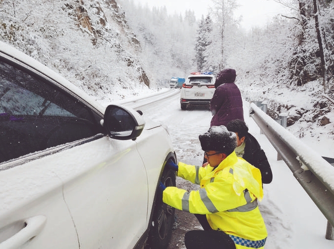 1月20日,湖北省建始縣公安局茅田派出所民警給被困車輛安裝防滑鏈。謝露攝