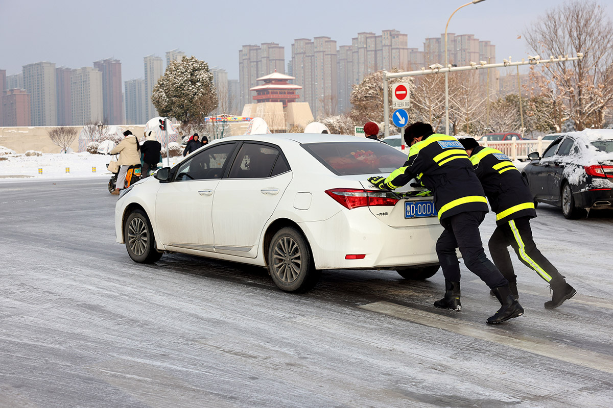 2月5日,山東省棗莊市公安局市中分局交通警察大隊(duì)民警在道路上幫助推行雪中打滑被困的車(chē)輛。近日,受冷空氣影響,棗莊市出現(xiàn)雨雪冰凍天氣過(guò)程。棗莊市公安局市中分局交通警察大隊(duì)啟動(dòng)惡劣天氣應(yīng)急管理預(yù)案,全員上崗,保障市民出行平安。