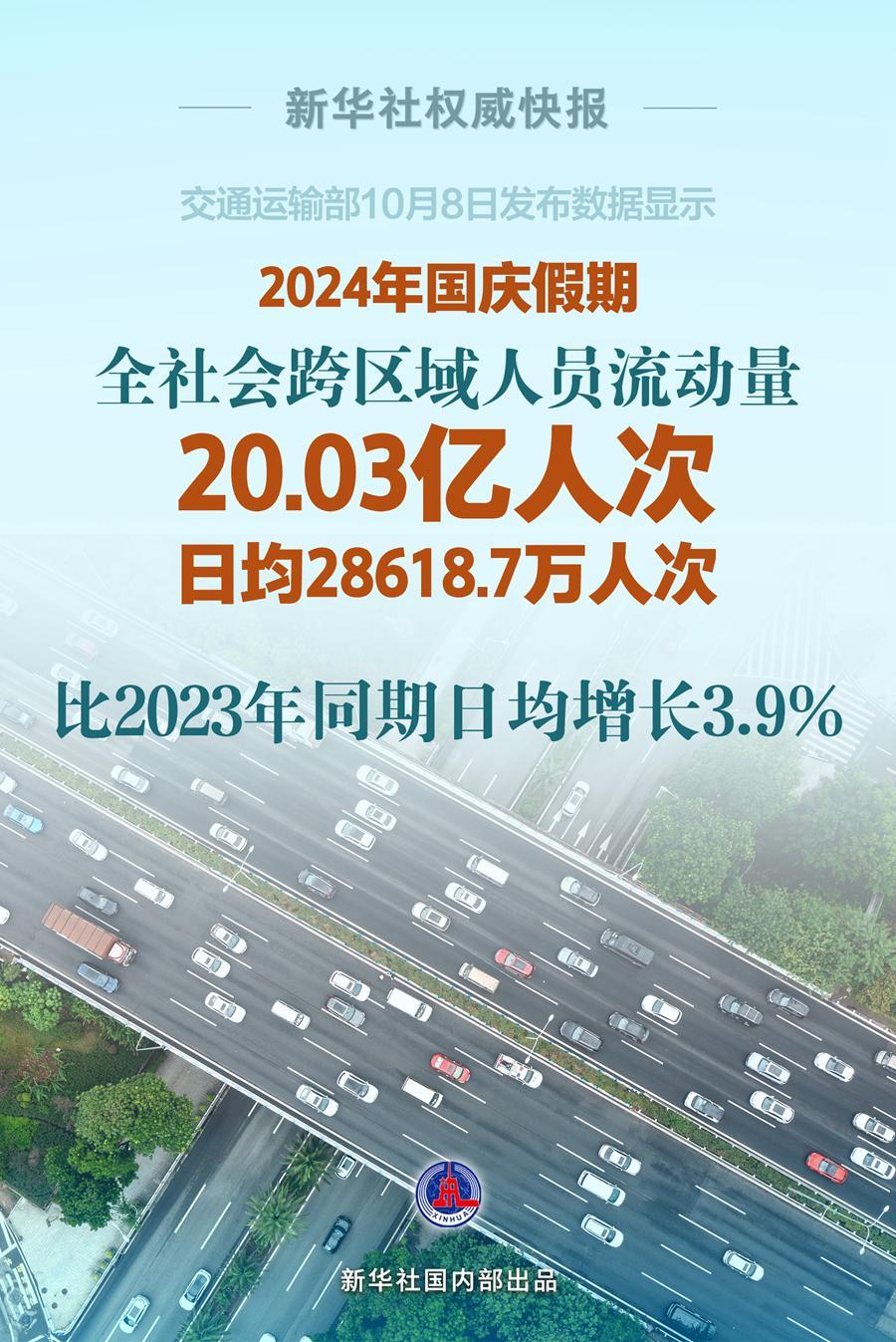 全社會(huì)跨區(qū)域人員流動(dòng)量20.03億人次,日均28618.7萬(wàn)人次,比2023年同期日均增長(zhǎng)3.9%