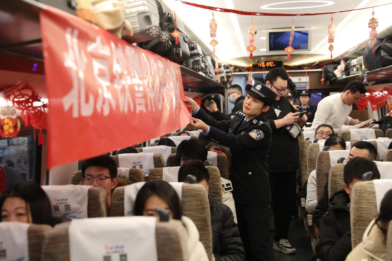 站臺上,由北京西開往哈爾濱西的G935次列車已準(zhǔn)備就緒,車廂內(nèi)喜慶的拉花、火紅的窗花,將整個車廂裝點(diǎn)得年味十足。一條“北京鐵警伴您平安出行”的橫幅揭開了此次列車上慶小年的主題。