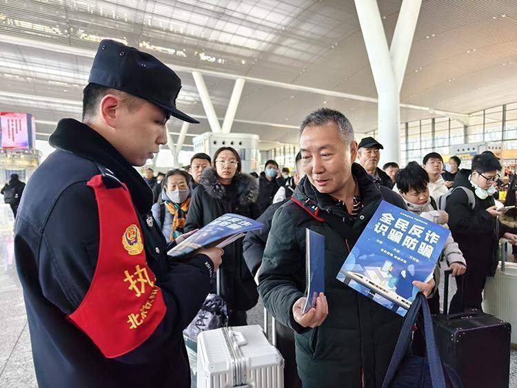 圖為民警在車(chē)站向旅客宣傳反詐常識(shí)。