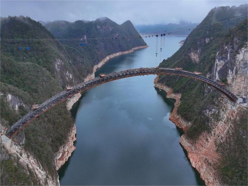 3月5日,貴州甕馬鐵路南北延伸線項(xiàng)目控制性工程烏江特大橋順利合龍。烏江特大橋全橋長約520米,主跨337米,橋面至江面高度約200米。