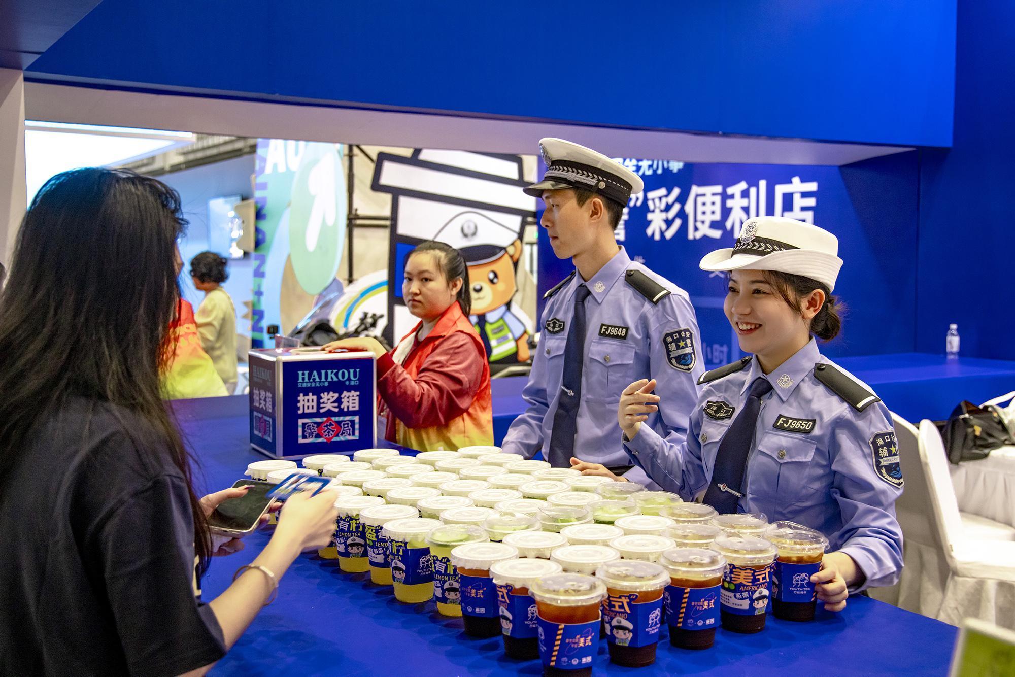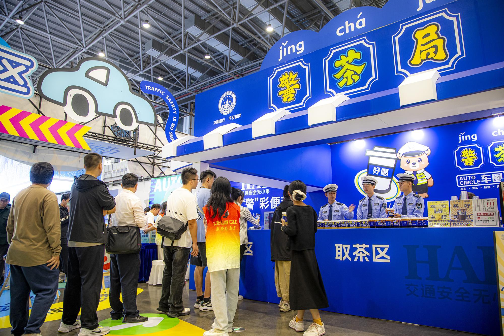 走進1號展館,“警茶局”創(chuàng)意攤位前排起長龍。市民掃描二維碼參與“交通安全快測”答題,答對6題即可兌換限量特調(diào)飲品——清新檸檬茶“幸盔有檸”杯身印有醒目戴頭盔安全提示,咖啡特調(diào)“系好美式”以安全帶印制“系好安全帶,平安出發(fā)”標(biāo)語,巧妙融合普法知識點。交警化身“茶飲師”為市民送上安全特調(diào)飲品,貼心叮囑出行安全事項,警民互動其樂融融。