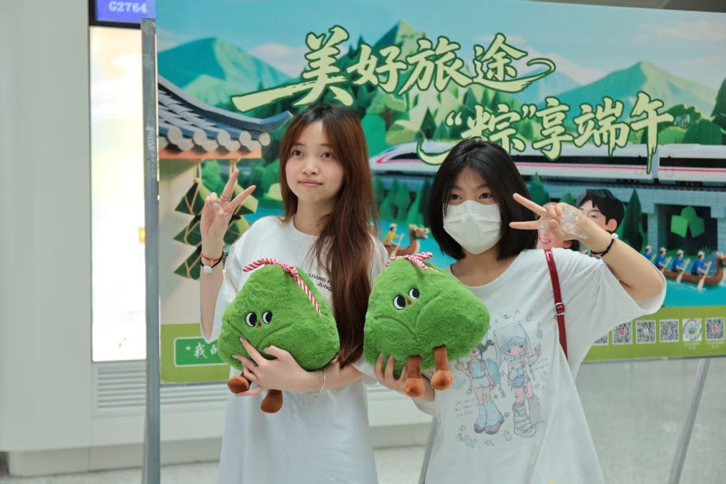 圖為贛州西站候車旅客在“美好旅途 ‘粽’享端午”背景板前打卡拍照。(國鐵南昌局集團(tuán)公司供圖)