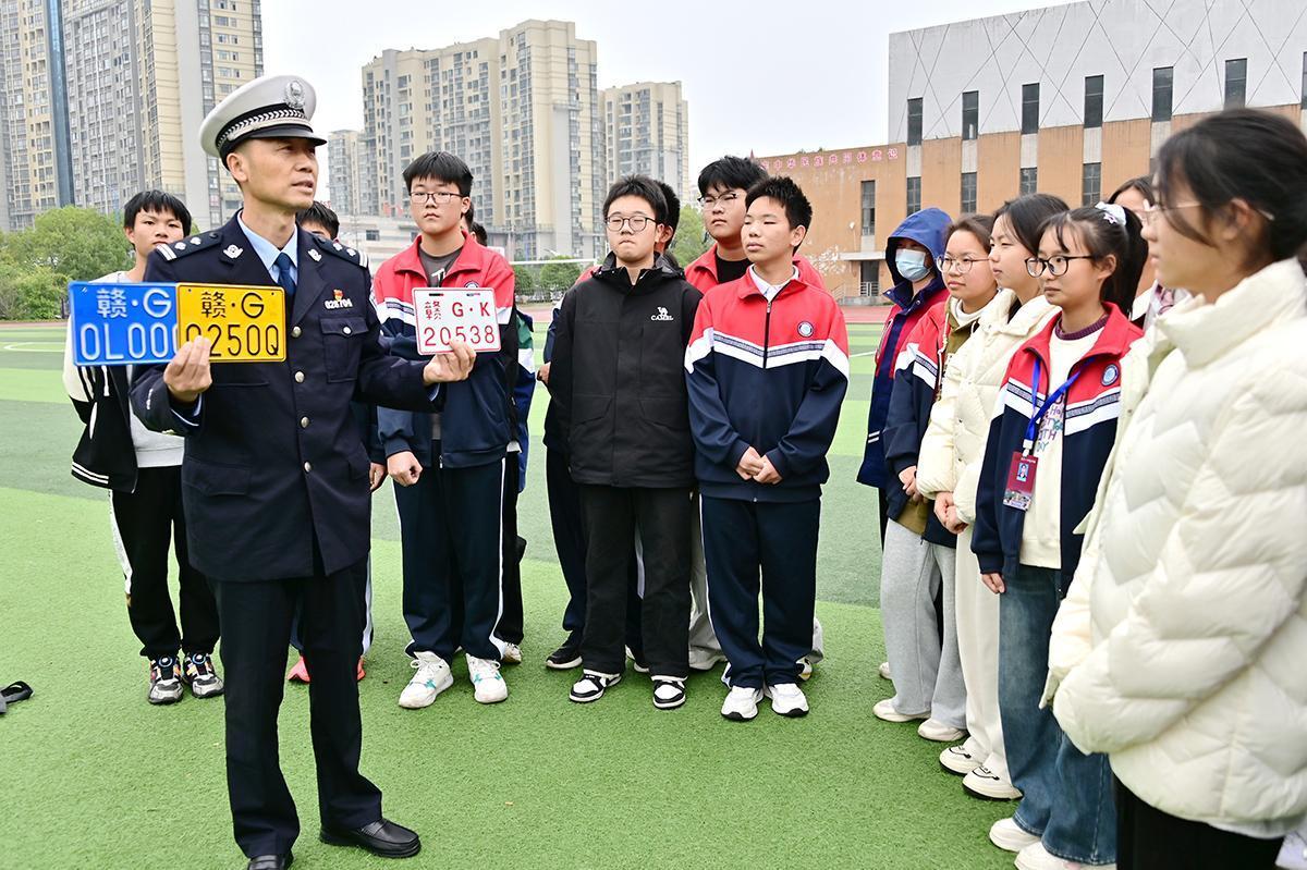 圖為民警向?qū)W生介紹電動(dòng)自行車(chē)、二輪摩托車(chē)(含電動(dòng)摩托車(chē))三種不同顏色牌照的區(qū)別。