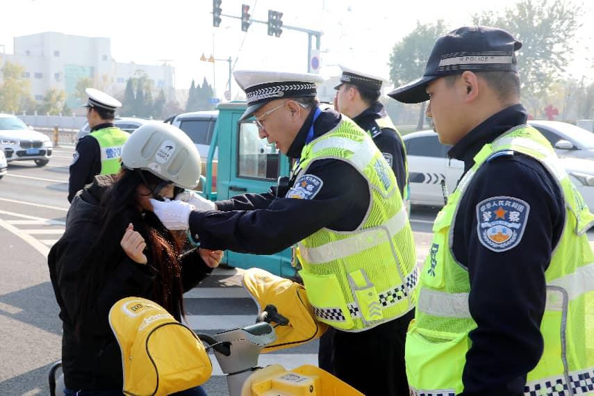 圖為東營交警在路口引導(dǎo)電動車駕乘人員正確佩戴頭盔。