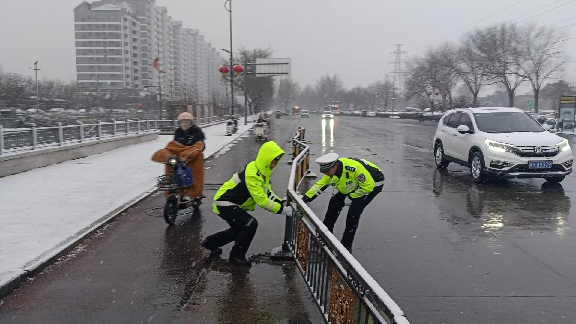 在疏導(dǎo)交通的同時,執(zhí)勤交警時刻關(guān)注路面狀況,及時處置各類突發(fā)險情。1月29日晚,高速各大隊為防止雪后路面、橋面結(jié)冰,聯(lián)合交通運輸?shù)炔块T預(yù)防性播撒融雪劑;30日早高峰期間,勤務(wù)四大隊執(zhí)勤人員在大南門附近發(fā)現(xiàn)因風(fēng)雪倒地的護欄,迅速合力將其扶正固定,消除了由此可能引發(fā)的交通事故隱患;勤務(wù)一大隊則加強了對轄區(qū)國省道、橋梁、涵洞等重點路段的巡邏頻次,細(xì)致排查積雪、結(jié)冰及各類安全隱患,確保不放過一處風(fēng)險。