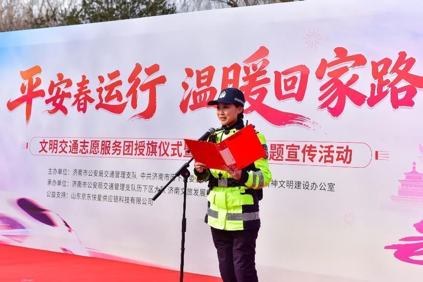 活動(dòng)現(xiàn)場(chǎng),歷下區(qū)交警大隊(duì)女子中隊(duì)民警代表進(jìn)行交通安全宣講,表明了護(hù)航春運(yùn)交通安全、全力服務(wù)市民出行的決心。