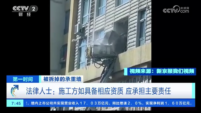 被拆掉的承重墻 法律人士:施工方如具備相應(yīng)資質(zhì) 應(yīng)承擔(dān)主要責(zé)任