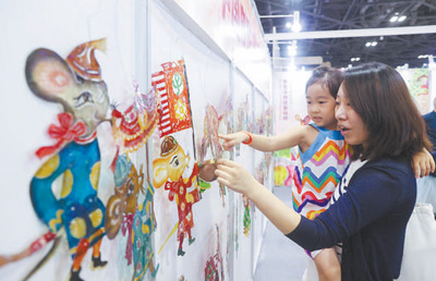 家長與孩子在首屆中國(北京)動畫周上觀看展出的皮影。陳曉根攝
