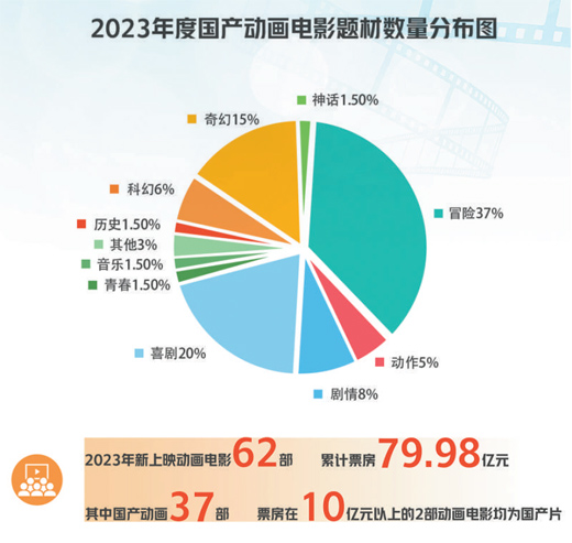 現(xiàn)實和預(yù)期,給了動畫人開拓事業(yè)的底氣。據(jù)不完全統(tǒng)計,2013年,上映33部動畫電影,總票房為16.4億元,國產(chǎn)動畫占比為38%。2023年新上映動畫電影62部,累計票房79.98億元,其中,國產(chǎn)動畫37部(含港澳臺);票房在10億元以上的2部動畫電影均為國產(chǎn)片。無論作品數(shù)量還是票房表現(xiàn),國產(chǎn)動畫電影都樹立了自己的“主場優(yōu)勢”,也在觀眾中贏得信任與口碑。