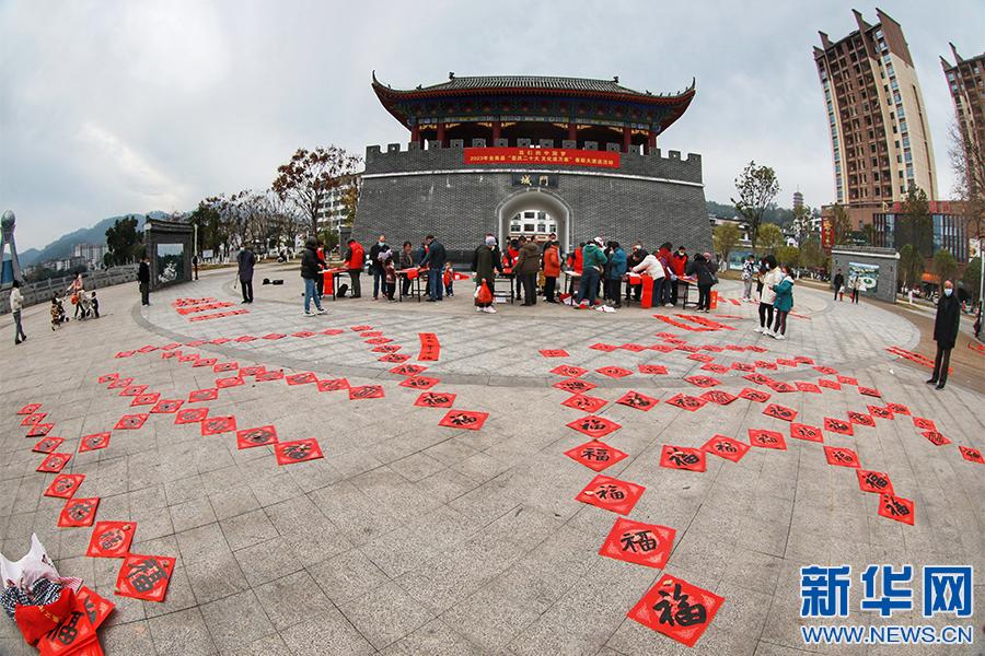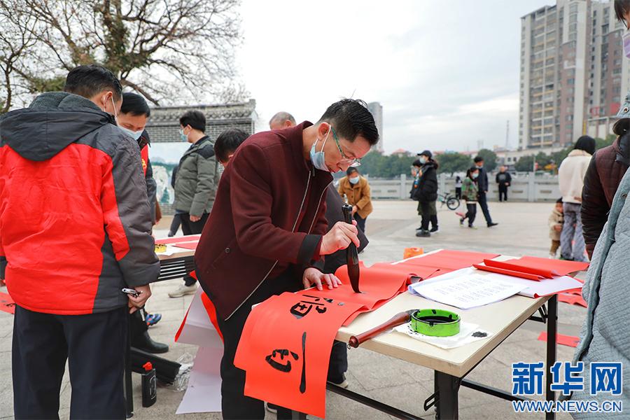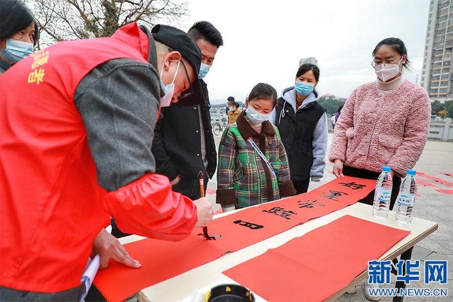 新春佳節(jié)將至,江西省贛州市全南縣組織縣書法家協(xié)會會員、書法愛好者分組深入全縣各個(gè)鄉(xiāng)鎮(zhèn)、各城市社區(qū)為群眾現(xiàn)場免費(fèi)書寫春聯(lián),送上新春的美好祝福。(譚茜予 尹其奇)