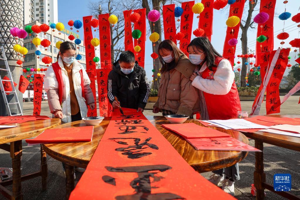 1月12日,貴州省畢節(jié)市七星關(guān)區(qū)青龍街道辦事處書法愛好者為居民書寫春聯(lián)。新華社發(fā)(韓賢普攝)