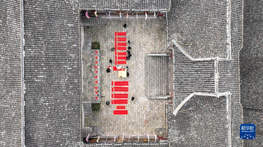 1月12日,在重慶市酉陽土家族苗族自治縣龔灘古鎮(zhèn),居民在寫春聯(lián)(無人機照片)。新華社發(fā)(邱洪斌攝)