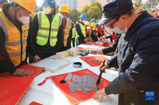 1月16日,安徽省文聯(lián)文藝志愿服務(wù)隊(duì)來(lái)到中鐵四局合肥新橋機(jī)場(chǎng)S1線先行段項(xiàng)目工地,為一線建設(shè)者寫(xiě)春聯(lián)、送福字。