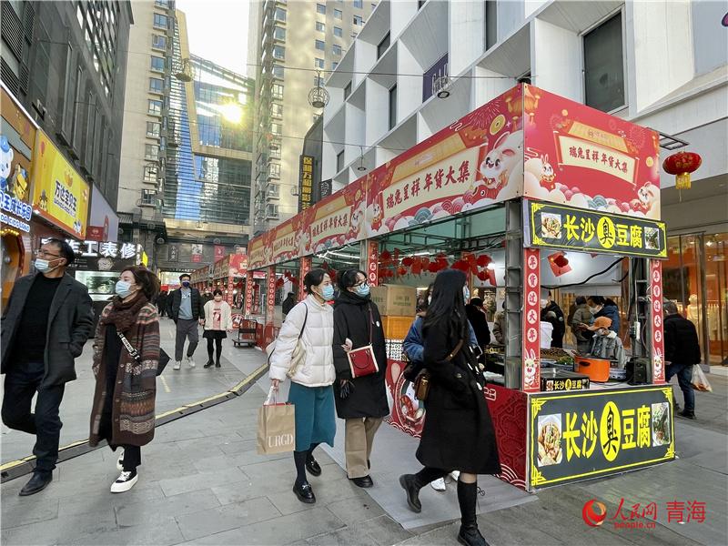 力盟商業(yè)步行街是西寧市繁華熱鬧的街區(qū)之一,瓜子糖果、春聯(lián)燈籠、海鮮肉類等年貨琳瑯滿目;糖葫蘆、臭豆腐、棉花糖等各色美食香氣撲鼻,市民聚集于此,體會(huì)濃濃年味,感受城市煙火氣。
