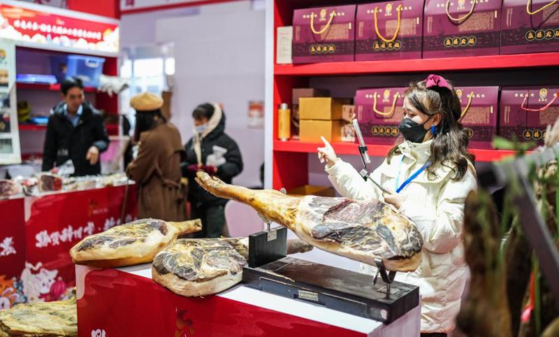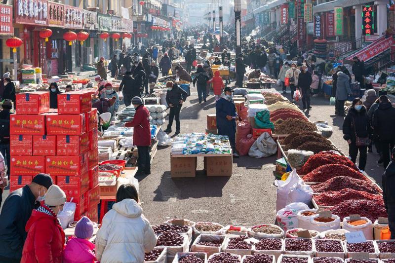 1月12日,市民在綏芬河市龍須溝步行街的年貨大集上選購年貨。新華社記者 謝劍飛 攝