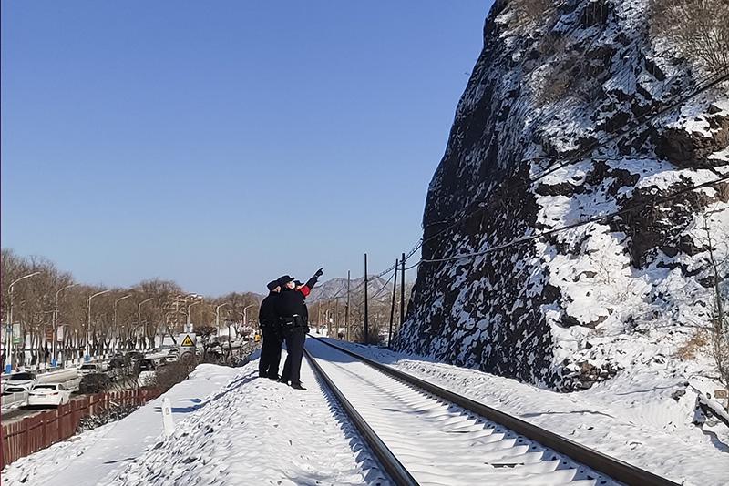 大風(fēng)天承接雨雪天,京承鐵路線上,呼嘯的寒風(fēng)吹起地面積雪,雪沫拍打在臉上冰涼刺骨。承德站派出所所長(zhǎng)會(huì)亞君帶領(lǐng)民警來(lái)到線路的一處山體旁,“雨雪天開(kāi)展線路督導(dǎo)檢查,要確保線路設(shè)備設(shè)施運(yùn)轉(zhuǎn)正常,還要防止周?chē)襟w松動(dòng),落石影響行車(chē)”,會(huì)亞君告訴記者,在雪地里踏著石渣行進(jìn)很慢,一兩個(gè)小時(shí)身上就開(kāi)始出汗,山風(fēng)一吹就更冷了。