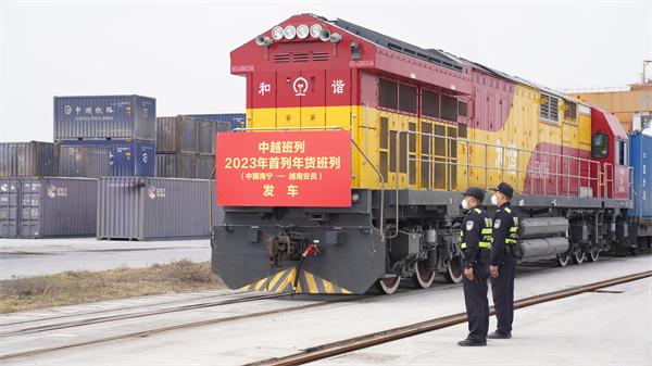 1月19日,一列滿載黑木耳、風味蘑菇、糖果、啤酒等特色食品以及日用品等貨物的中越班列從南寧國際鐵路港駛出,預計24小時后到達越南安員站。這是今年以來的第7列中越班列,為東盟國家同慶春節(jié)送去滿滿年貨。