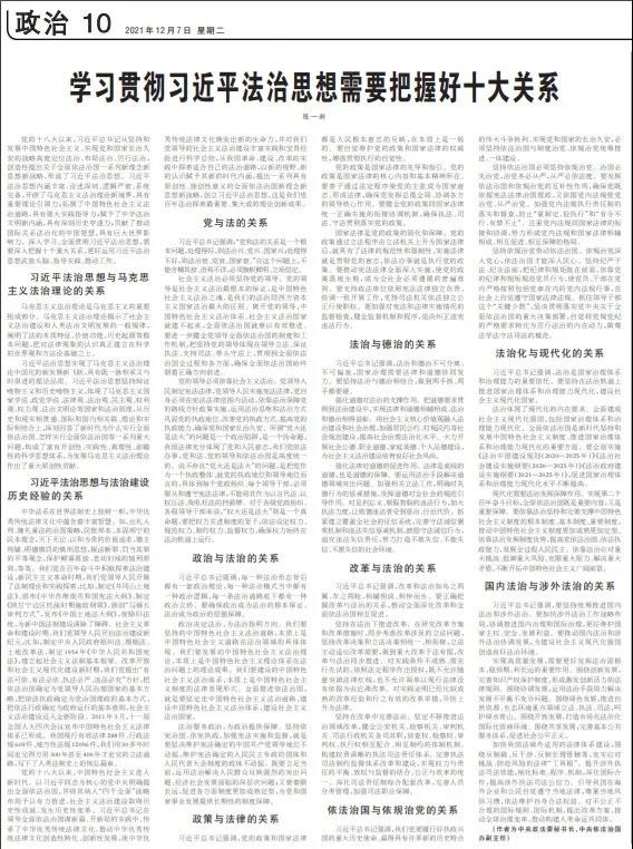 12月7日,人民日?qǐng)?bào)刊發(fā)中央政法委秘書長、中央依法治國辦副主任陳一新學(xué)習(xí)貫徹習(xí)近平法治思想的署名文章,從習(xí)近平法治思想與馬克思主義法治理論的關(guān)系、習(xí)近平法治思想與法治建設(shè)歷史經(jīng)驗(yàn)的關(guān)系、黨與法的關(guān)系、政治與法治的關(guān)系、政策與法律的關(guān)系、法治與德治的關(guān)系、改革與法治的關(guān)系、依法治國與依規(guī)治黨的關(guān)系、法治化與現(xiàn)代化的關(guān)系、國內(nèi)法治與涉外法治的關(guān)系等十個(gè)方面,系統(tǒng)闡述如何學(xué)習(xí)貫徹習(xí)近平法治思想的精髓要義。長安君為大家?guī)砦恼氯摹?/span>