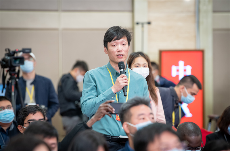 10月19日,黨的二十大新聞中心舉行記者招待會。圖為本報記者提問。 本報記者 王建軍 攝