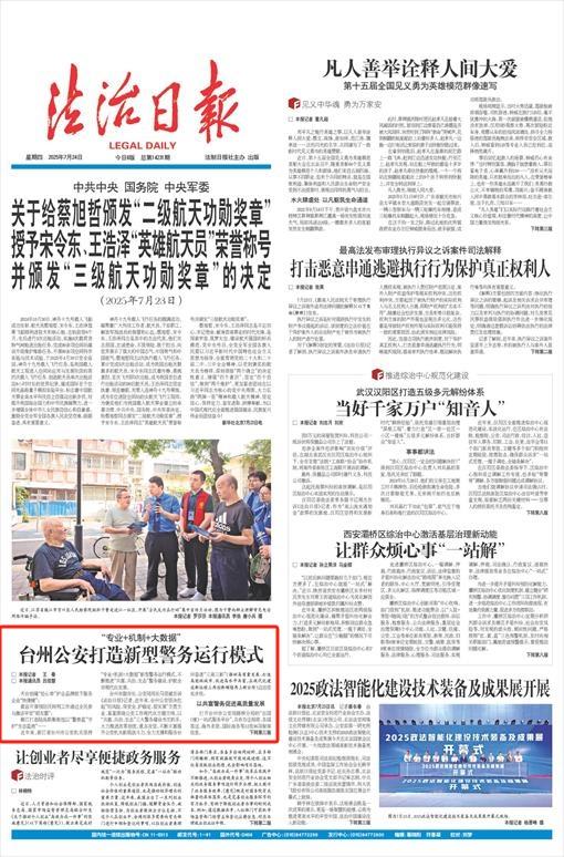 臺(tái)州市副市長、公安局局長馬堅(jiān)斌告訴《法治日報(bào)》記者,近年來,臺(tái)州公安堅(jiān)決扛起“防風(fēng)險(xiǎn)、保安全、護(hù)穩(wěn)定、促發(fā)展”主責(zé)主業(yè),緊緊圍繞公安工作現(xiàn)代化主題主線,以“共富、共治、生態(tài)”三大警務(wù)建設(shè)為主抓手,大力推進(jìn)改革創(chuàng)優(yōu)、重點(diǎn)攻堅(jiān),不斷豐富提升公安機(jī)關(guān)新質(zhì)戰(zhàn)斗力,全力支撐和服務(wù)臺(tái)州奮進(jìn)“三高三新”(推動(dòng)高質(zhì)量發(fā)展、打造高能級城市、促進(jìn)高水平共富,在現(xiàn)代化建設(shè)新征程上再創(chuàng)新輝煌再上新臺(tái)階)邁出堅(jiān)實(shí)步伐。