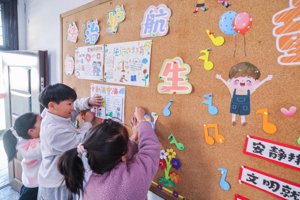 2025年12月9日,浙江省諸暨市暨南街道中心學(xué)校王家井小學(xué)的學(xué)生把自己創(chuàng)作的法治宣傳畫(huà)貼到教室的宣傳欄中。新華社記者 徐昱 攝