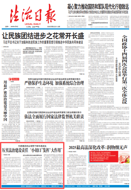 今年全國(guó)兩會(huì)上,多位人大代表、政協(xié)委員接受《法治日?qǐng)?bào)》記者采訪時(shí)表示,在述法現(xiàn)場(chǎng),地方黨政主要負(fù)責(zé)人以第一人稱述“我”,向上級(jí)“一把手”匯報(bào)年度依法履職情況,通過“一把手抓一把手”的“小切口”,發(fā)揮壓實(shí)“關(guān)鍵少數(shù)”法治建設(shè)責(zé)任的“大作用”,已成為提升領(lǐng)導(dǎo)干部依法辦事能力的重要手段、推動(dòng)突出問題解決的重要渠道和公眾參與法治建設(shè)評(píng)價(jià)的重要途徑。