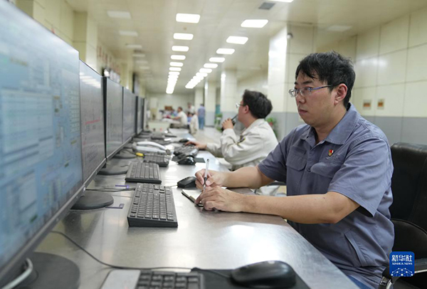 邯寶煉鋼廠特檔技術主管、轉爐車間副主任唐笑宇(右)在轉爐車間控制室工作(2022年9月7日攝)。新華社記者 楊世堯 攝