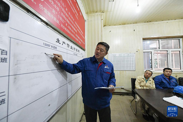 劉伯鳴在廠房會(huì)議室內(nèi)為工友講解生產(chǎn)任務(wù)(2022年9月17日攝)。新華社記者 王松 攝