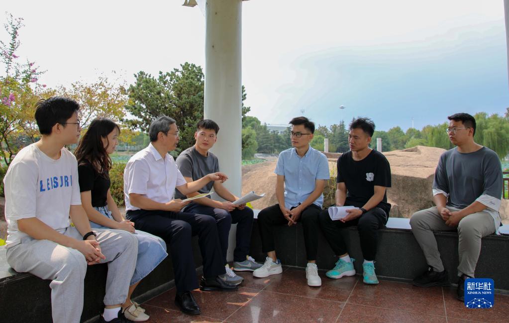 9月12日,安徽師范大學(xué)馬克思主義學(xué)院教授路丙輝(左三)與學(xué)生們?cè)谛@內(nèi)的文思亭交談。新華社記者 曹力 攝
