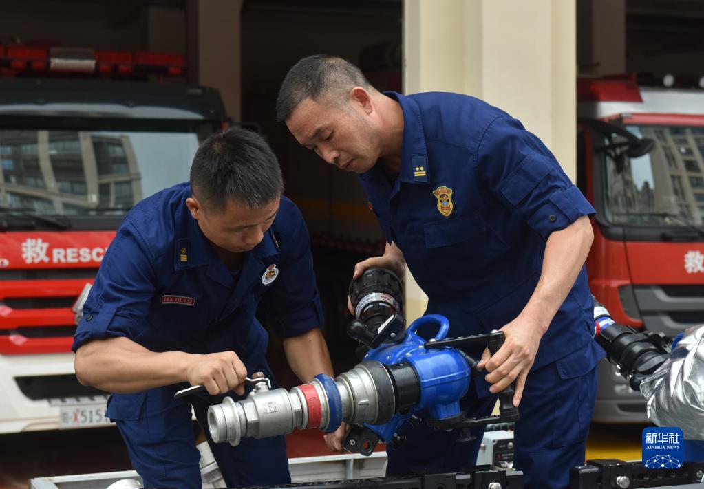 在江西省南昌市消防救援支隊(duì)特勤大隊(duì)營院內(nèi),李勝利(右)在檢查裝備器材(2020?年10月8日攝)。新華社發(fā)(熊超 攝)