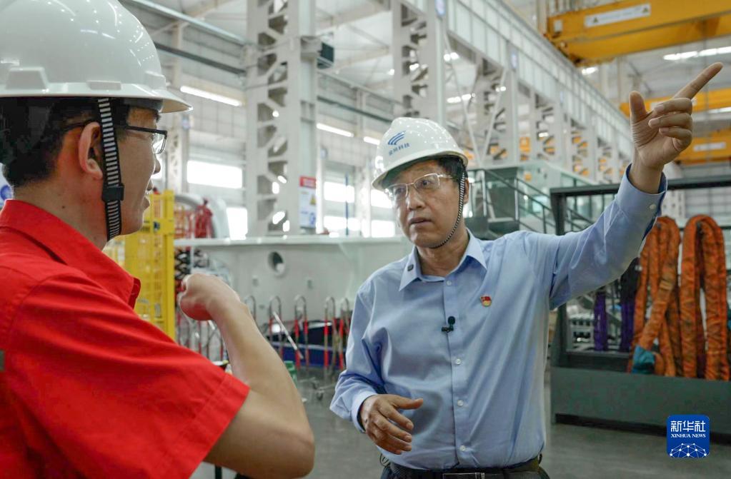 在金風科技新疆達坂城風電裝備產(chǎn)業(yè)基地零碳智能工廠內(nèi),武鋼(左)與技術工程師在一起交流(2022年8月6日攝)。新華社發(fā)