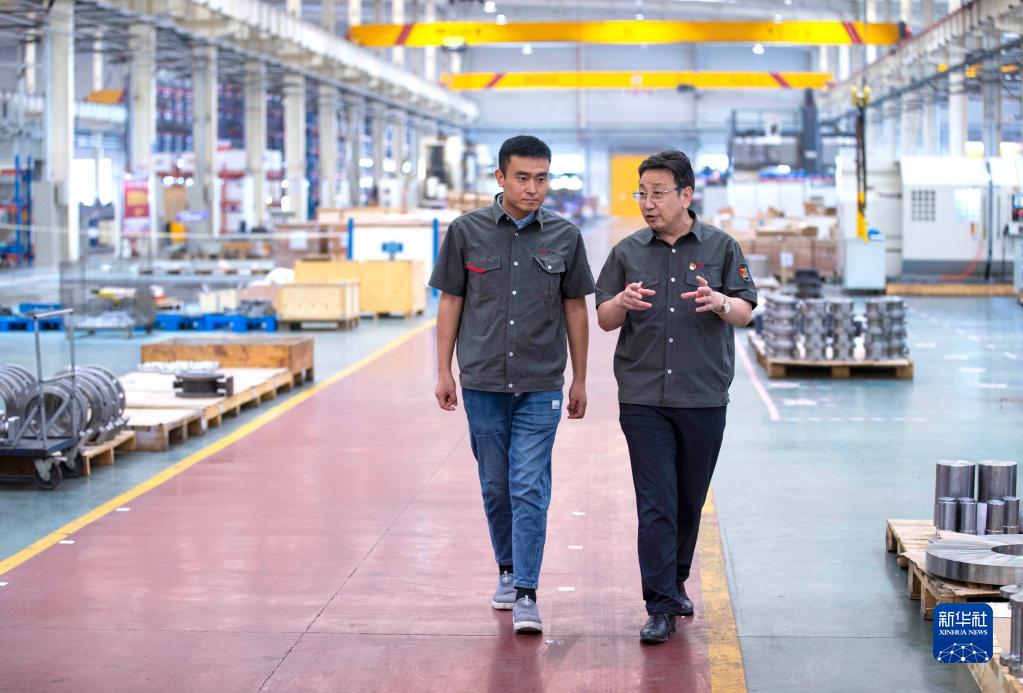 在位于寧夏吳忠市的吳忠儀表有限責(zé)任公司自動化產(chǎn)業(yè)園數(shù)字化裝配車間內(nèi),馬玉山(右)與技術(shù)人員交流(9月12日攝)。 新華社記者 楊植森 攝