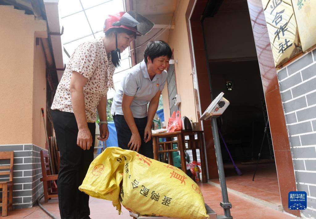 在廣西蒼梧縣六堡鎮(zhèn)山坪村,祝雪蘭(右)和村民一起稱(chēng)剛采回來(lái)的茶葉重量(2022年9月22日攝)。新華社記者 陸波岸 攝