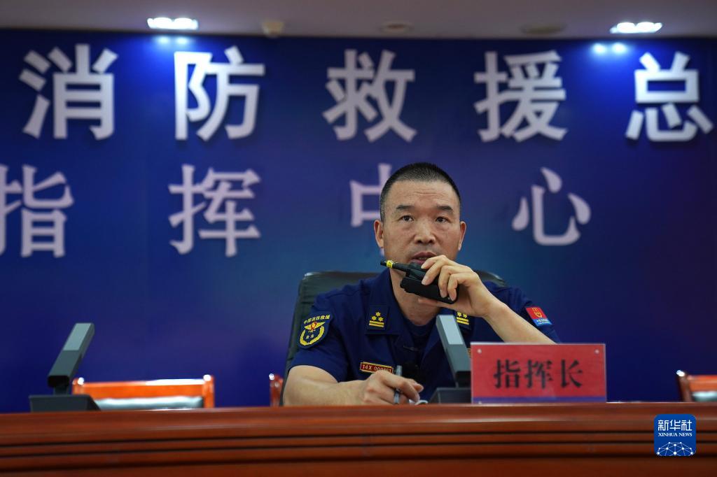 江西省消防救援總隊指揮中心專業(yè)技術一級指揮長李勝利在江西消防救援總隊指揮中心進行遠程調度(2022年9月14日攝)。新華社記者 萬象 攝