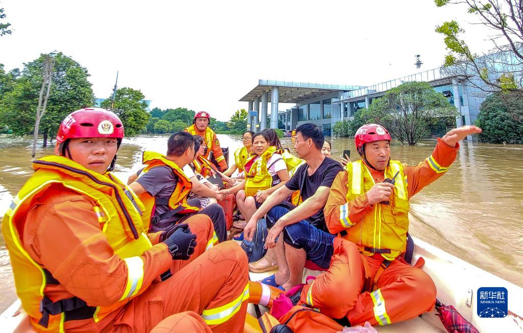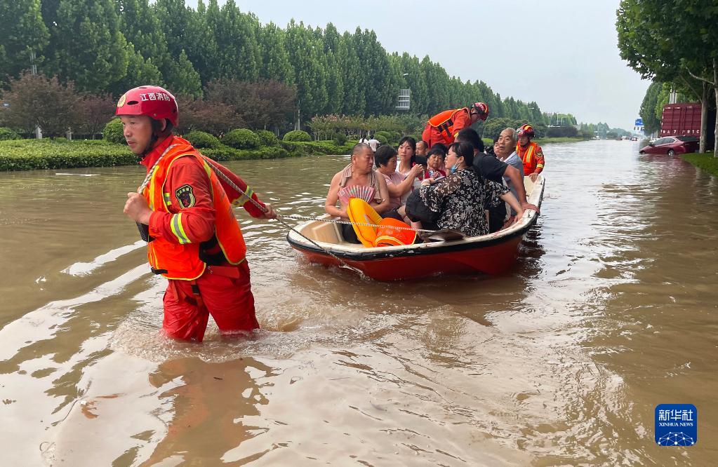 在河南省鄭州市中牟縣,李勝利(右一)在疏散被困群眾(2021年7月22日攝)。新華社發(fā)(田聰 攝)