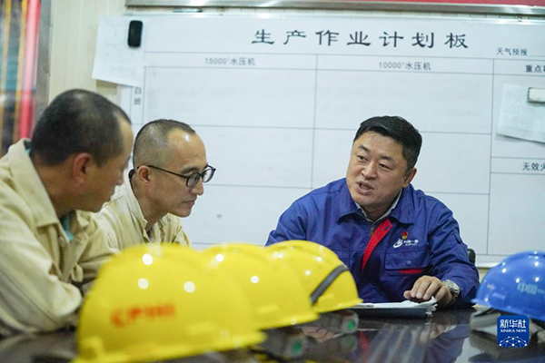 劉伯鳴(右一)在廠房會議室內(nèi)與工友討論生產(chǎn)作業(yè)事項(xiàng)(2022年9月17日攝)。新華社記者 王松 攝