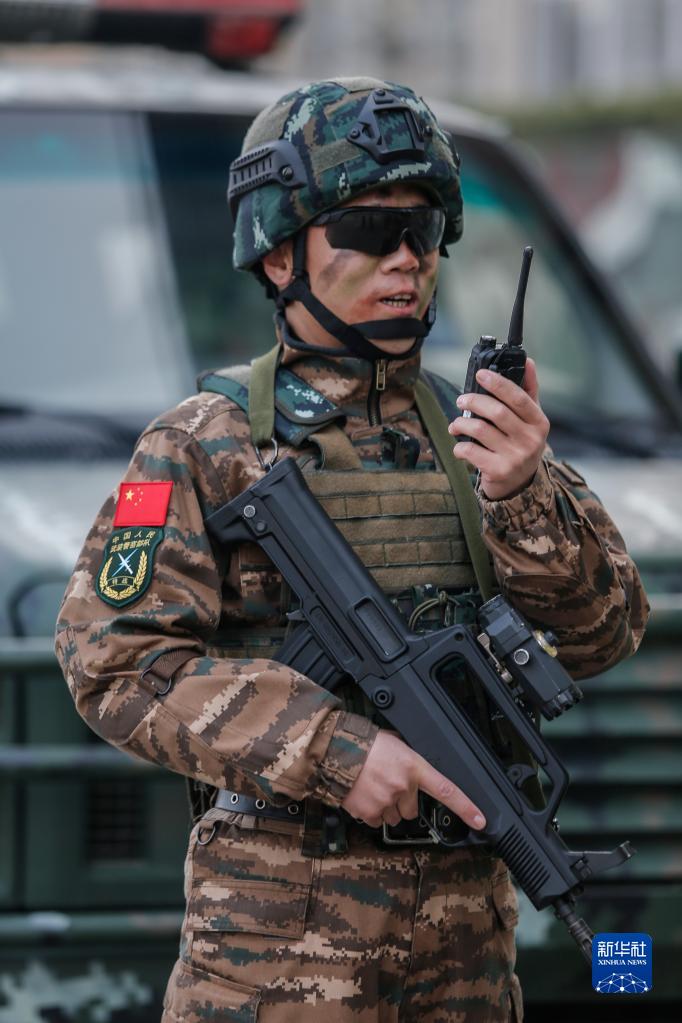 武警河北總隊某部大隊長李闖在演練中下達任務(wù)指令(2021年3月4日攝)。新華社發(fā)(張丹 攝)