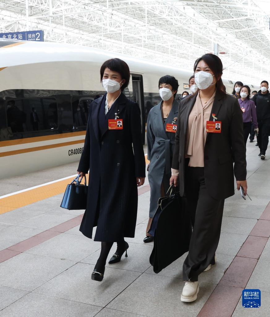 10月13日,來(lái)自?xún)?nèi)蒙古自治區(qū)的黨的二十大代表乘高鐵抵達(dá)北京北站。新華社記者 張玉薇 攝
