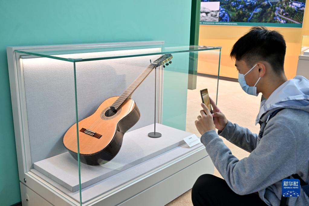 10月8日,一名觀眾在貴州展區(qū)拍攝正安吉他。貴州省正安縣目前已成為全球最大吉他生產基地,已帶動近15000人在家門口就業(yè)、6000余人穩(wěn)定脫貧。新華社記者 李鑫 攝