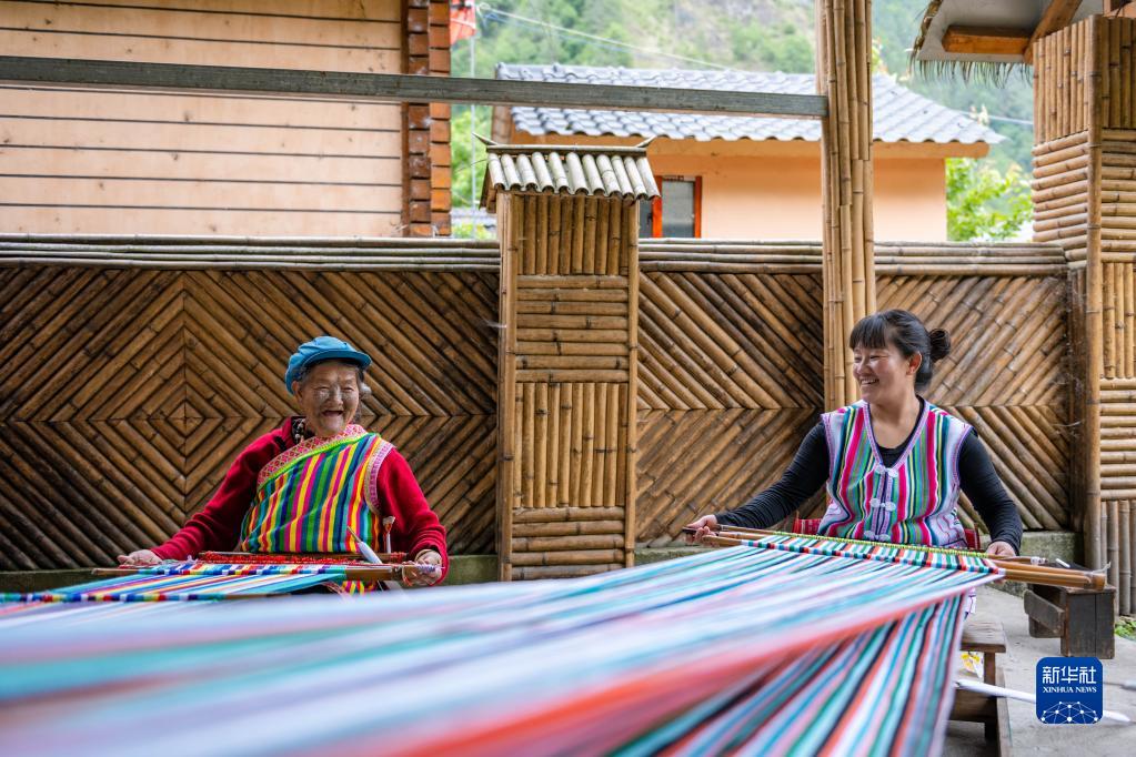 在云南省貢山獨(dú)龍族怒族自治縣獨(dú)龍江鄉(xiāng)迪政當(dāng)村,獨(dú)龍族老人李文仕(左)和女兒在編織獨(dú)龍?zhí)?2022年5月10日攝)。新華社記者 曹夢(mèng)瑤 攝