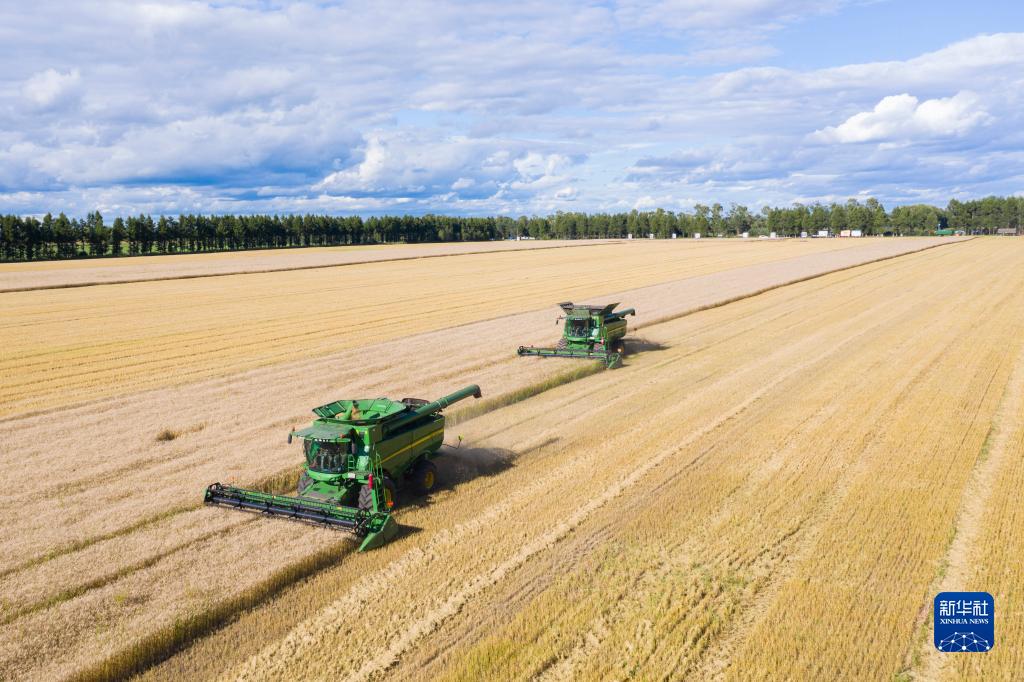 黑龍江北大荒,一臺(tái)臺(tái)收割機(jī)車(chē)往來(lái)穿梭,豐收的畫(huà)卷在這片黑土地鋪展開(kāi)來(lái)。
