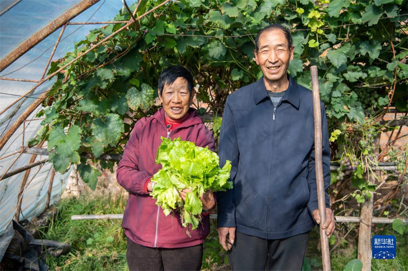 10月16日,在山西省岢嵐縣宋家溝村,村民周有娥(左)和老伴在自家大棚里合影。新華社記者 楊晨光 攝