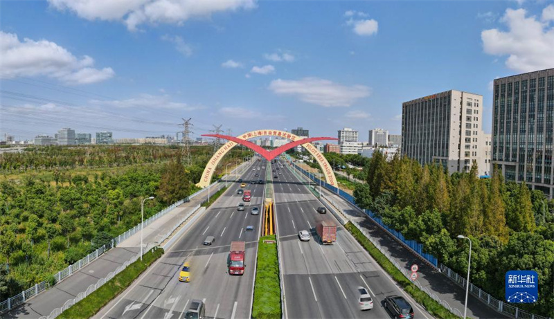 這是中國(上海)自由貿易試驗區(qū)保稅片區(qū)的標志性景觀“海鷗門”(10月17日攝,無人機照片)。新華社記者 方喆 攝
